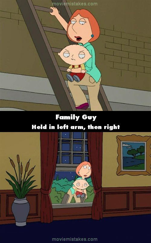 Continuity mistake: Going up the ladder Lois has Stewie in her left arm. However, as she comes through the window he is in her right arm. (00:06:00)