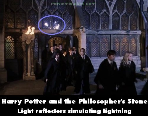 Visible crew/equipment: When Dumbledore gives the order to the students to follow the Prefects towards their dorms after the troll came out from the dungeon, just a moment before Harry warns Ron that Hermione is unaware of what is happening, some light reflectors simulating lightning are reflected on the glass above the pathway where the students come from. (01:05:55)