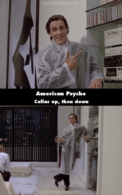 Continuity mistake: When Patrick Bateman murders Paul Allen, the collar on his raincoat is either up or down, depending on the shot. (00:27:49)