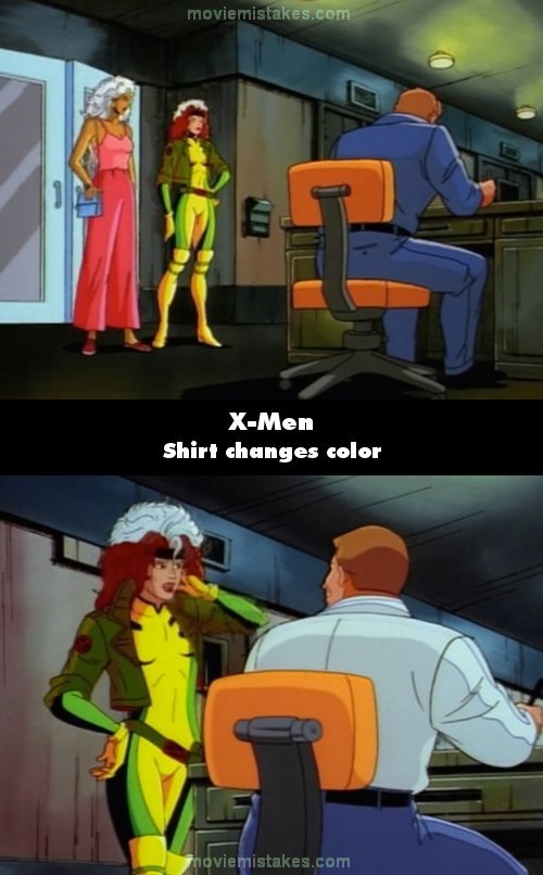 Continuity mistake: When Rogue and Storm first enter the jail, the desk clerk is wearing a blue shirt. When Rogue begins to flirt with him, his shirt is now white. (00:09:48)