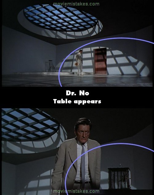 Continuity mistake: When Dent walks into the room to be questioned by Dr. No we don't see the table with the spider cage in the first side shot but Dent only walks a few feet from the chair, and suddenly there's a table. (00:38:00)
