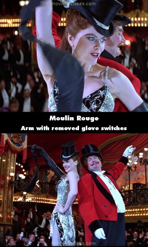 Continuity mistake: During the scene where Satine and Zidler are together on the stand singing 'Diamonds Are A Girl's Best Friend', Satine takes off her right glove and shakes it in her right hand. In the next shot, it is her left glove and she has her right glove back on. (00:16:30)