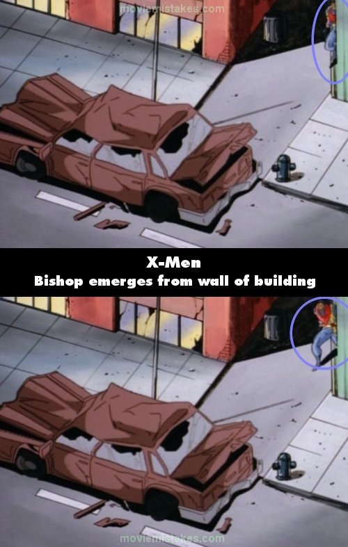 Revealing mistake: When Bishop is stepping out of the alley, you can see that he actually appears out of thin air and proceeds to step out from the outer wall of the building on the right. (00:10:15)