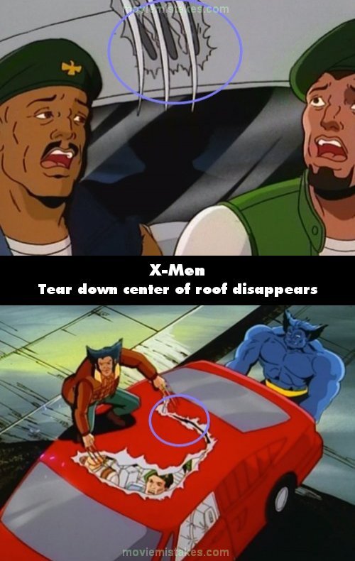 Continuity mistake: When Wolverine is slicing off the roof of the car, he is first shown to be running his claws down the center. A couple of shots later, he is cutting a square-shaped hole into the roof, with no tears going down the center. (00:12:17)