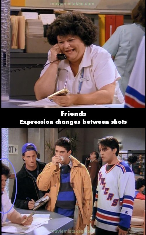 Continuity mistake: The facial expression of the receptionist changes drastically between instant cuts when she says the line "any minute now" (00:14:00)