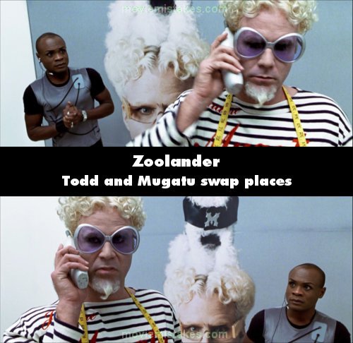 Continuity mistake: In the scene where Mugatu is talking to Mr. Ballstein, Todd gives Mugatu the phone to talk to Mr. Ballstein. The camera cuts to a shot where you see Mr. Ballstein in the bathroom. In the shot after that, Todd and Mugatu have switched places. (00:22:30)