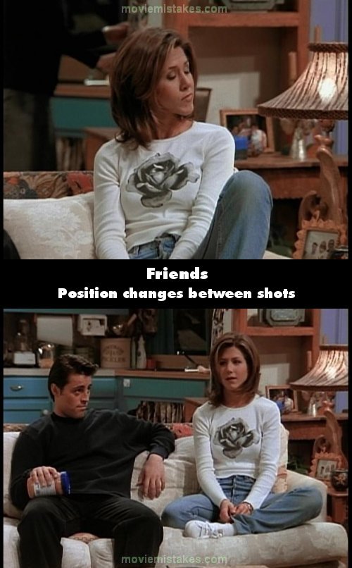 Continuity mistake: The way Rachel is sitting when discussing seeing Chandler naked is constantly changing. (00:07:00)