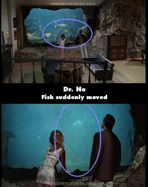 Continuity mistake: When Bond and Honey are looking at the fish for the first time, the position of the fish changes between instant cuts. (01:24:30)