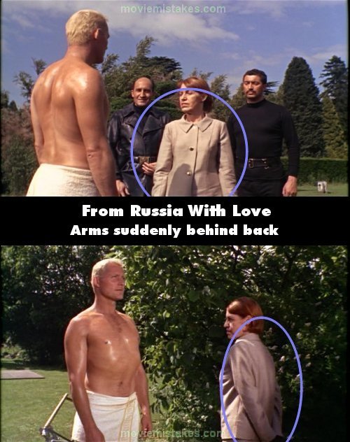 Continuity mistake: When Klebb is inspecting Grant, she has her arms by her side. Camera cuts and now they are clasped behind her back. (00:13:30)