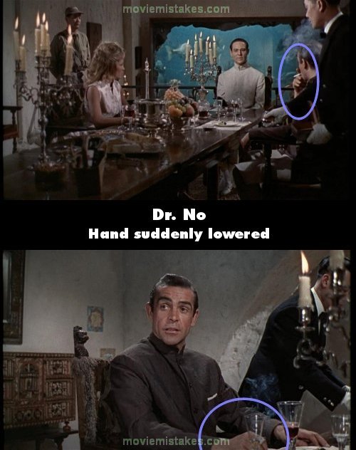 Continuity mistake: When Dr. No is explaining how he left with $10 million, Bond has his hand raised to his mouth. Camera changes to Dr. No's perspective and Bond's hand is lowered. (01:26:20)