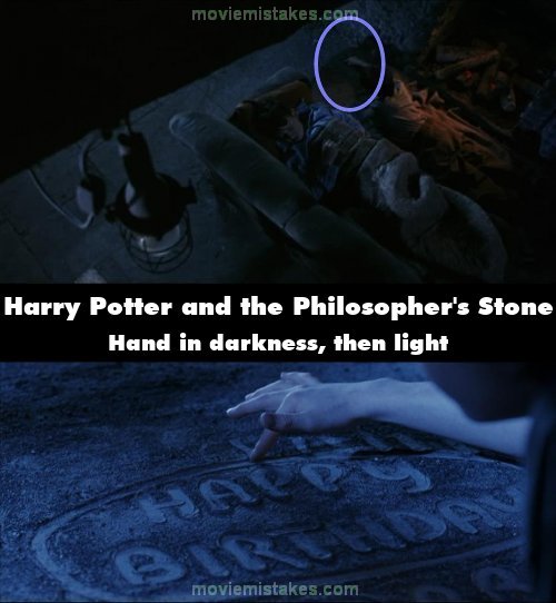 Continuity mistake: When we first see Harry drawing a cake in the dirt, his hand is in the shadow created by the sofa when lightning strikes. When we see a closeup of the drawing, his hand is in the light. (00:12:50)