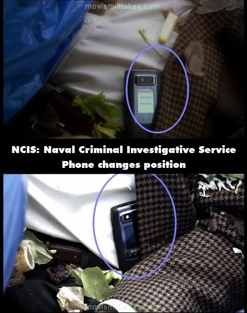 Continuity mistake: The position of the mobile phone on the victim changes from when we see the Admiral discovering the body and NCIS taking the photos. (00:02:40)