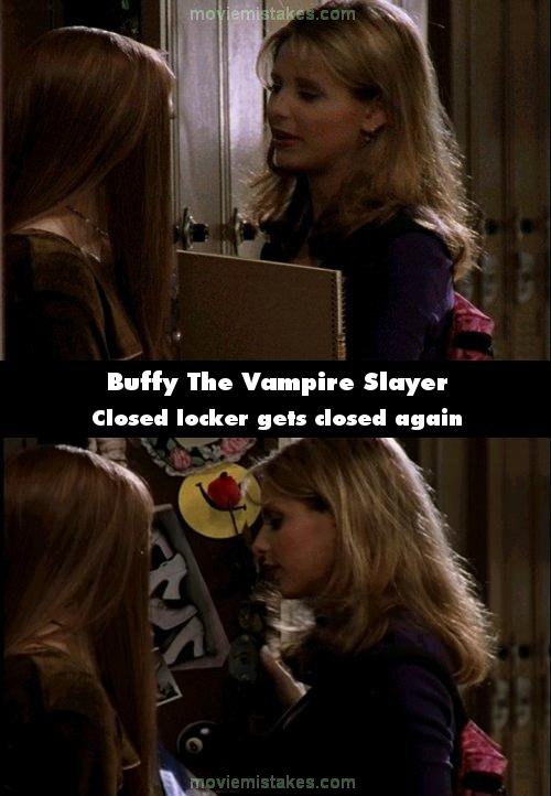 Continuity mistake: In the season 1 episode "Nightmares", Buffy is talking to Willow about her mom's divorce and she shuts her locker. A few seconds later she shuts her locker again. (00:02:55)