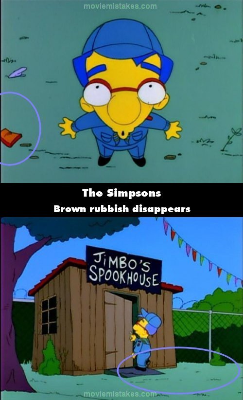 Continuity mistake: When Millhouse first spots the spookhouse, there is a red item on the floor by him, as he walks towards the spookhouse the item has gone. (00:03:00)