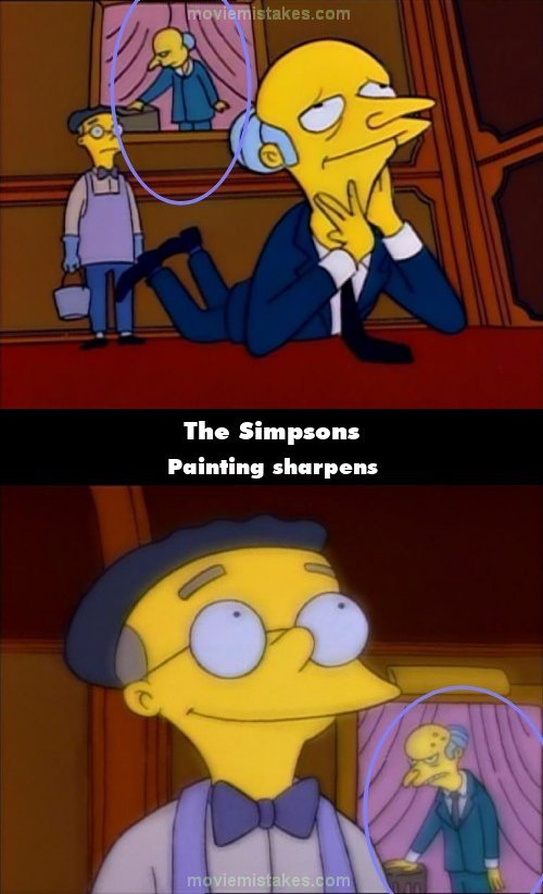 Continuity mistake: When Burns is lay on the floor telling Smithers that he dreamed of Marge again last night, the painting behind Smithers is very badly painted and very childish in appearance. Burns' head is completely disproportionate for example. When the shot changes to Smithers the painting is now a lot more detailed and no longer looks childish. (00:14:42)