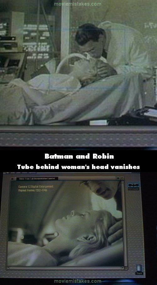 Continuity mistake: When Dr. Freeze bends down to kiss his wife right before his accident, there is a tube of some sort behind her (in the distance), then as he kisses her the tube is gone. (00:20:15)
