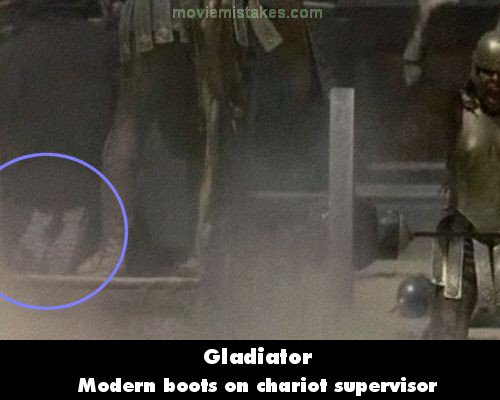 Visible crew/equipment: In the first battle in the Colosseum, right before the female gladiator gets chopped in half by the chariot, you can see someone in a black outfit wearing what looks like safety or hiking boots driving the chariot. (01:22:50)