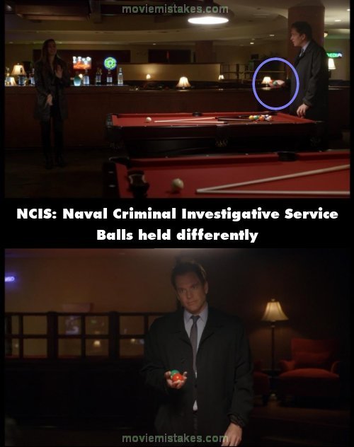 Continuity mistake: When Tony and Ziva are first in the pool hall, Tony has 2 balls (1 red, 1 green) in his hand. In one shot they are in his hand next to each other in a horizontal line. Camera changes and now they are next to each other vertically. (00:07:30)