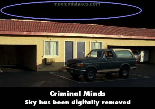 Deliberate mistake: In the outside shot of the unsub's motel in Pensacola, Florida, the sky is black as if someone behind the scenes tried to digitally remove part of the background in post, but did a really bad job.
