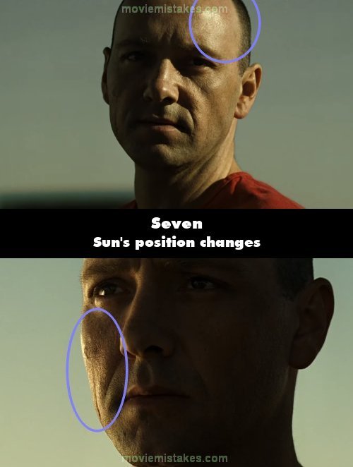 Continuity mistake: In the final scene where they are in the desert, the sun hits John Doe first on the left and then on the right side of his face in two different takes.