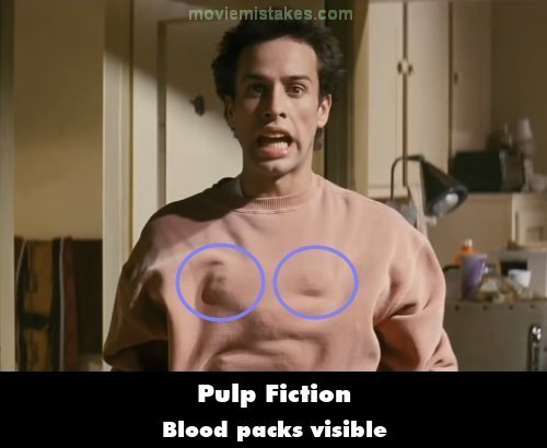 Revealing mistake: When Jules and Vincent, after having killed Brett, shoot the fourth man who was hiding in the bathroom, fake blood packs can be briefly seen under his shirt in the points where the bullets will hit just before he's shot.