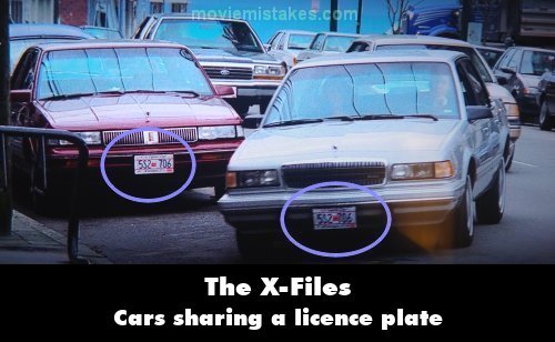 Other mistake: Mulder pulls in to park in front of a red car. The front plate on both Mulder's and the red car is the same: 5S2 706. (00:27:37)