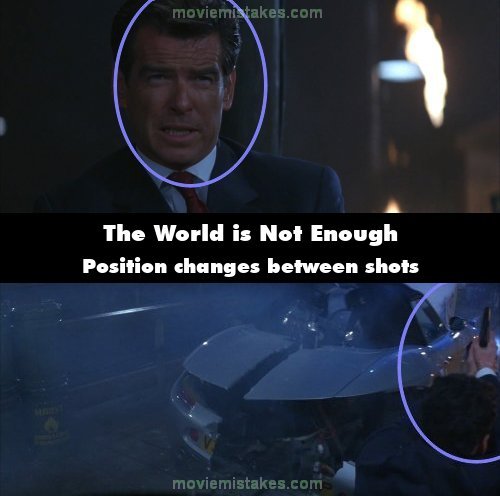 Continuity mistake: Just after Bond's BMW is sawn in half by the chopper, he says "Q's not gonna like this." In the close-up of him saying this, his hands (holding a gun) are not held up in front of his face. In the very next shot, viewed from behind, his hands are held high up and pointing towards the helicopter overhead. (01:32:02)
