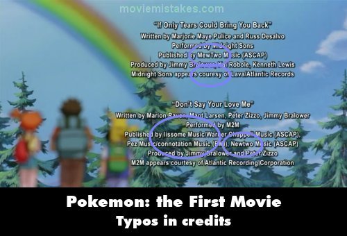 Character mistake: When "If Only Tears Could Bring You Back" appears in the retyped ending credits of the English dub, Mewtwo Music is misspelled as "MewTwo Music" and "Newtwo Music" with courtesy misspelled as "couresy." Also, Lissome Music is misspelled as "lissome Music" with Connotation Music misspelled as "connotation Music." (01:13:33)
