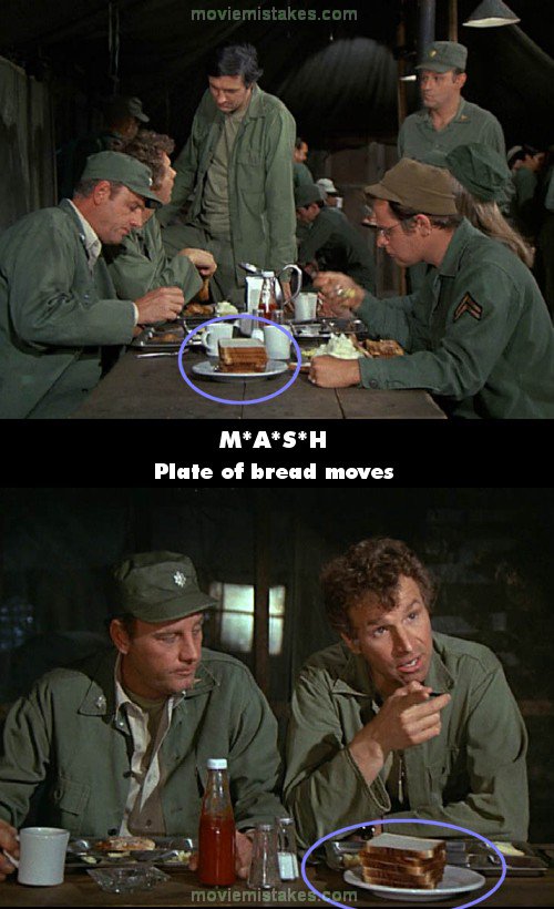 Continuity mistake: At lunch, when Frank is getting his own back against Hawkeye, in the long shots of the table the plate of bread is beside Henry and in the closeups it is in front of Trapper. (00:11:30)