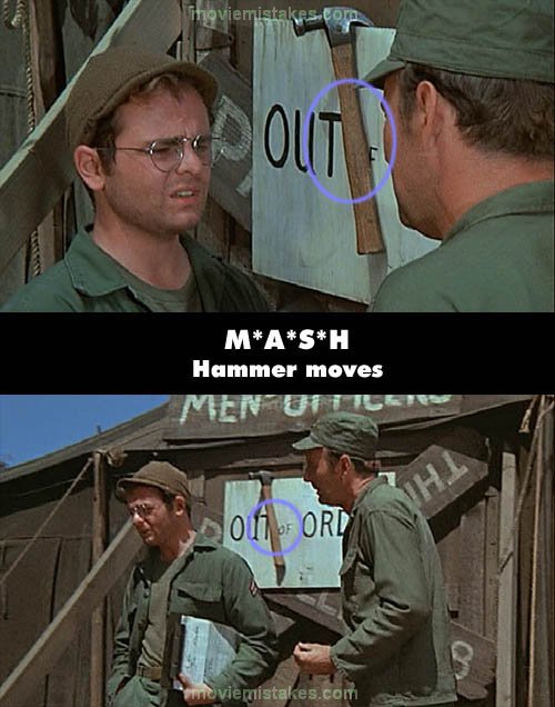 Continuity mistake: Radar hangs the hammer on the "Out of Order" sign and it is covering the 'of'. When he and Frank walk away the hammer has moved and is covering the 't' (00:15:20)