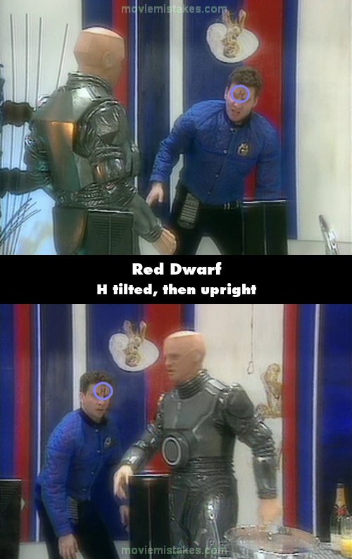 Continuity mistake: When Kryten tries to knock Rimmer unconscious by smashing a vase over his head, his 'H' falls slightly out of place, then in the next shot it is back upright.