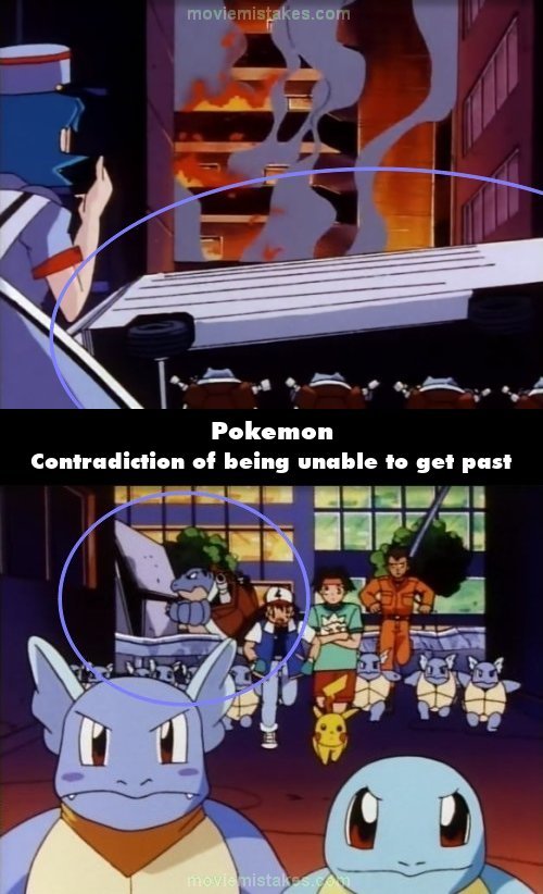 Plot hole: When Officer Jenny says why Captain Aidan needs to get Team Wartortle to the location of the final fire, she says that Team Blastoise's path is blocked by a lorry, and Team Squirtle is not powerful enough for the fire. This does not make sense for the former as Team Blastoise later pushes the same lorry aside. (00:13:41)