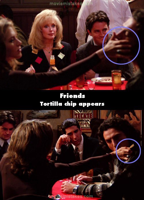 Continuity mistake: While everyone's at the restaurant Rachel dips a tortilla chip into guacamole and gets some on her hand. When Paolo takes a bite from the chip he also eats the guacamole off Rachel's hand while she's still holding the rest of the tortilla chip, but in the next closeup Rachel's hand is empty, then in the next shot the remaining tortilla chip reappears in Rachel's hand. (00:06:45)