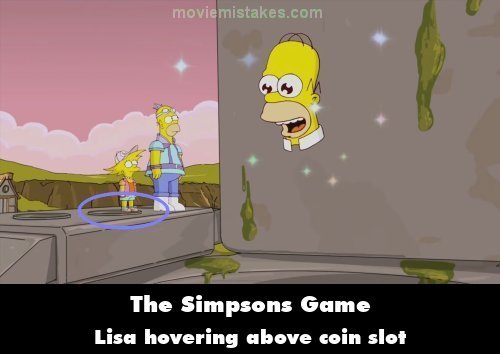 Revealing mistake: Big Super Happy Fun Fun Game: When Mr Sparkle is telling Homer and Lisa that he must return to his corporation, in the shot of him saying "Cel soy kills the hunger demon", Lisa can be seen positioned on top of one of the coin slots without falling into it, revealing an animation error where it appears she is hovering above it.