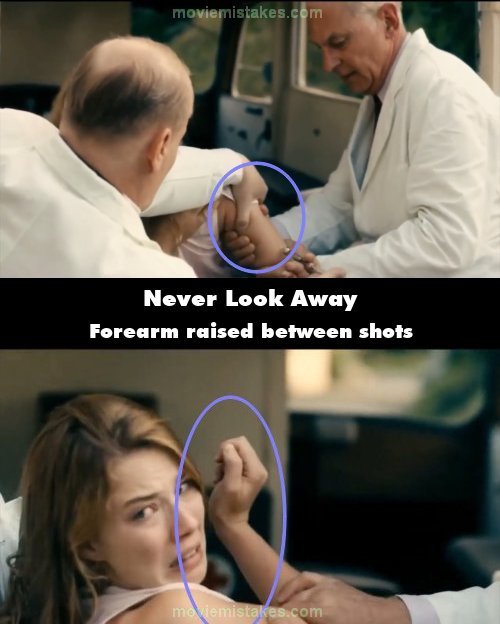 Continuity mistake: Whilst the doctors are trying to get Elisabeth into the van, one of them injects her to get her to relax. When this happens, her arm is lowered. But in the next shot, her forearm is suddenly raised. (00:17:46)