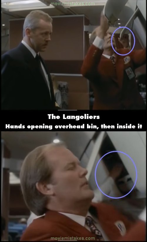 Continuity mistake: When boarding the plane, the airport manager puts Brian's bag into an overhead bin. Standing next to him, Rudy can be seen opening an overhead bin and his hands are placed on the door whilst he opens it. In the next shot, his hands are suddenly inside the overhead bin, putting his bag inside it. (00:06:25)