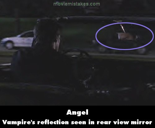Revealing mistake: In "To Shanshu in LA" in season one, as Angel is pulling out of parking lot to follow the W&H Trucks, you can see his reflection in his rear view mirror (vampires have no reflections). Also odd that throughout the first season the rear view mirror is removed in some episodes. (00:31:19)