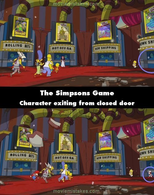 Other mistake: Game Over: Whilst the Game Engine is collapsing, there is a shot of the video game characters escaping their respective games, shown from on the ground, while the Simpsons toward the door back to Springfield. To the right, a character can be seen exiting the Big Super Happy Fun Game level, but the door behind him is closed.
