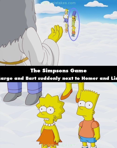 Continuity mistake: Game Over: When God says to the Simpsons that the Simpsons Game was a mini-game inside his Earth game, Bart is shown standing slightly ahead of Lisa, and Marge is standing slightly ahead of Homer. When the shot cuts to a closer angle of them, Bart and Lisa are side by side and Marge and Homer are side by side.
