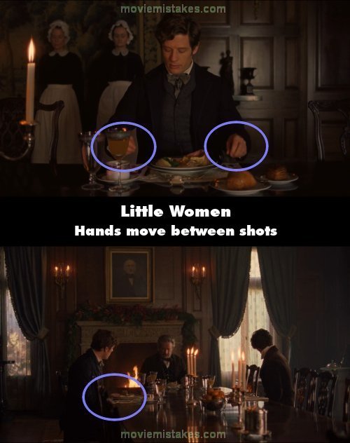 Continuity mistake: When Mr. Laurence, Laurie and John Brooke are having Christmas breakfast, John puts his hand on the table but in the next shot, his hands are not there. (00:29:37)
