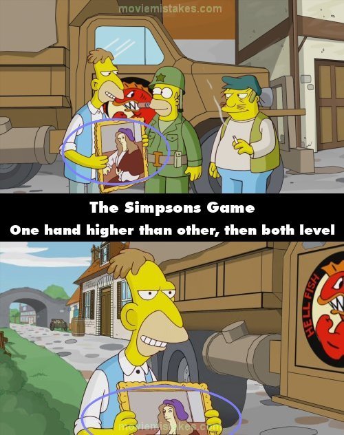 Continuity mistake: Medal of Homer: When the Mayor of the village shows Homer the painting, he has both hands placed on each side. The hand placed along the left side is near to the middle, whereas the hand placed along the right side is higher up. But in the next shot, both hands are level with each other.