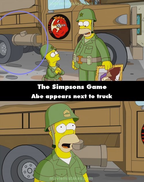 Continuity mistake: Medal of Homer: When Bart asks Homer if he can get some wine, Homer rejects his offer saying he's an American kid. When he says this, no-one else can be seen standing next to the truck behind them. Abe then suddenly appears in the next shot, saying "God bless America" while standing next to the truck.