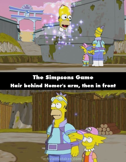 Continuity mistake: Big Super Happy Fun Game: When Homer and Lisa first approach the giant toilet and Mr Sparkle appears, Lisa is standing so that her hair is positioned behind Homer's left arm. When the shot cuts, her hair is positioned in front of Homer's arm.
