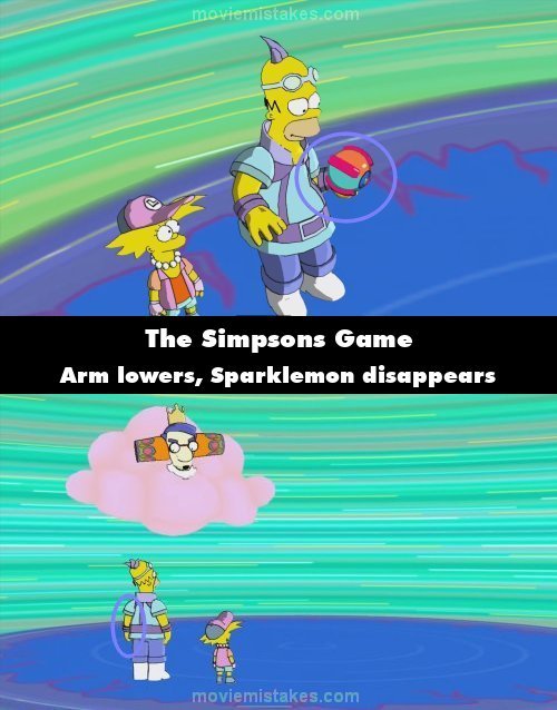 Continuity mistake: Big Super Happy Fun Game: When Homer is handed the Sparklemon after he and Lisa defeat Ralph, his left arm is raised when he grabs onto it. In the next shot, his left arm is at his side and the Sparklemon has disappeared. The same mistake is also made when they defeat Sherri and Terri.