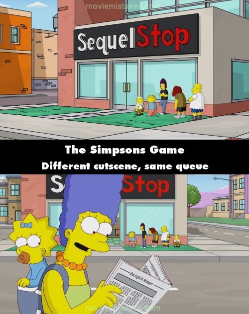 Other mistake: Mob Rules: In the opening cutscene for Bartman Begins, Uter, Ralph, Jimbo, Dolph and Kearney are seen queueing outside the Sequel Stop store. In the opening cutscene for Mob Rules, the exact same group of people can be seen coincidentally queueing outside the same store, despite the passage of time.