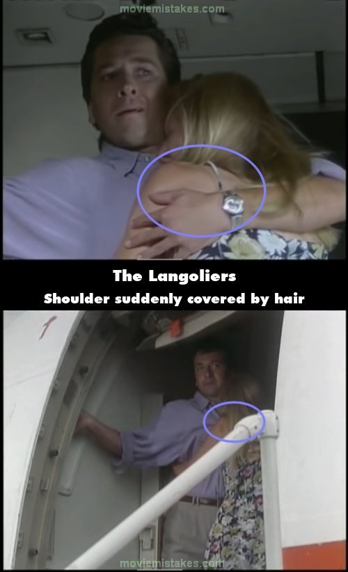 Continuity mistake: When the Langoliers begin eating Toomey, Nick grabs hold of Laurel while he closes the door. In one shot, Laurel's hair is under Nick's arm leaving her left shoulder exposed. But in the next shot as the door starts to close, Laurel's left shoulder is suddenly covered by her hair. (02:14:54)