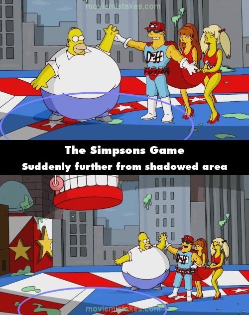 Continuity mistake: Around the World in 80 Bites: When Moe is congratulating Homer on winning the championship, the two are standing on the edge of a shadowed area. Homer is still next to the shadowed area when Duffman declares him champion, but when the shot cuts, the shadowed area is a few meters ahead of him.