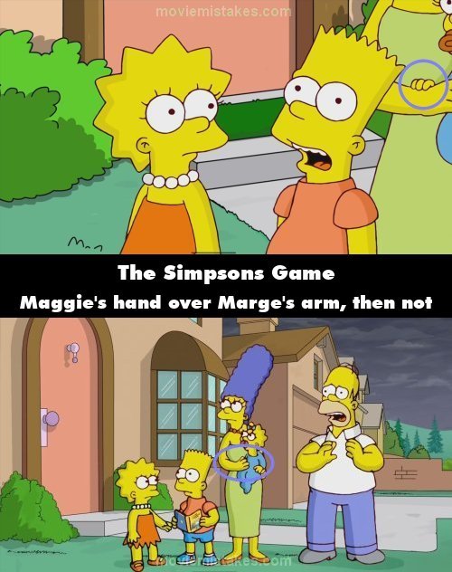 Continuity mistake: Bargain Bin: Whilst Bart says "This must be the level boss for this part of the game", Maggie can be seen being carried by Marge behind him. Maggie is shown with her hand over Marge's arm, but in the next shot, her hand is suddenly away from Marge's arm.