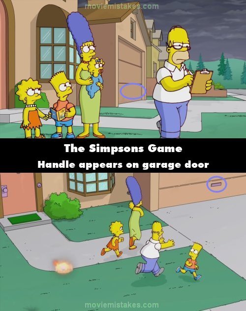 Continuity mistake: Bargain Bin: When the opening cutscene starts, the garage door has a handle on it. This handle disappears when Homer is doing his "looking busy" routine, then reappears when the family are running around the garden whilst being fired upon.