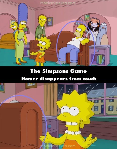 Continuity mistake: Game Over: Back in Springfield, Homer sits down on the right-hand side of the couch and places his arm over the armrest. A couple seconds later, when Lisa says "We have to talk to God", the corner of the couch can be seen, but Homer cannot be seen sitting in it.